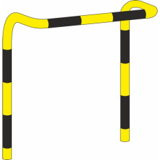 Protetor metálico com duas pernas, em vermelho e branco ou amarelo e preto.
